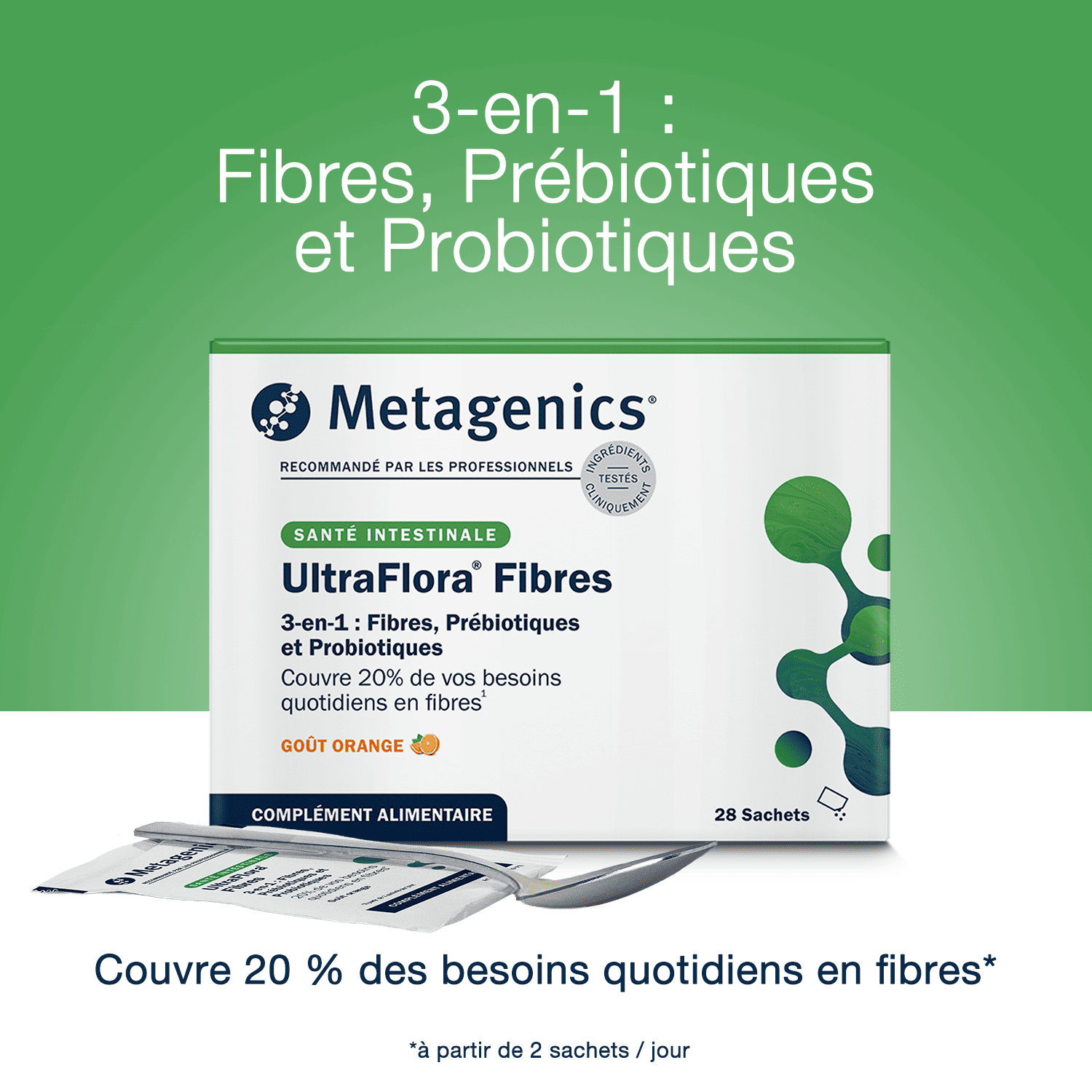 3-en-1 : fibres, prébiotiques et probiotiques. Couvre 20% de vos besoins quotidiens en fibres1